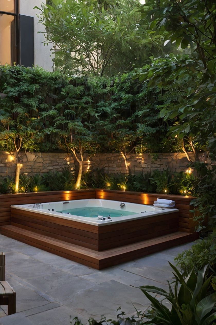 Imagine being surrounded by beautiful greenery and calming stone accents – it’ll make you feel like you’re on a relaxing tropical getaway! And hey, why not add some waterfalls or color-changing lights to really bring in that magical vibe? Sounds like the perfect oasis to unwind and escape from it all.