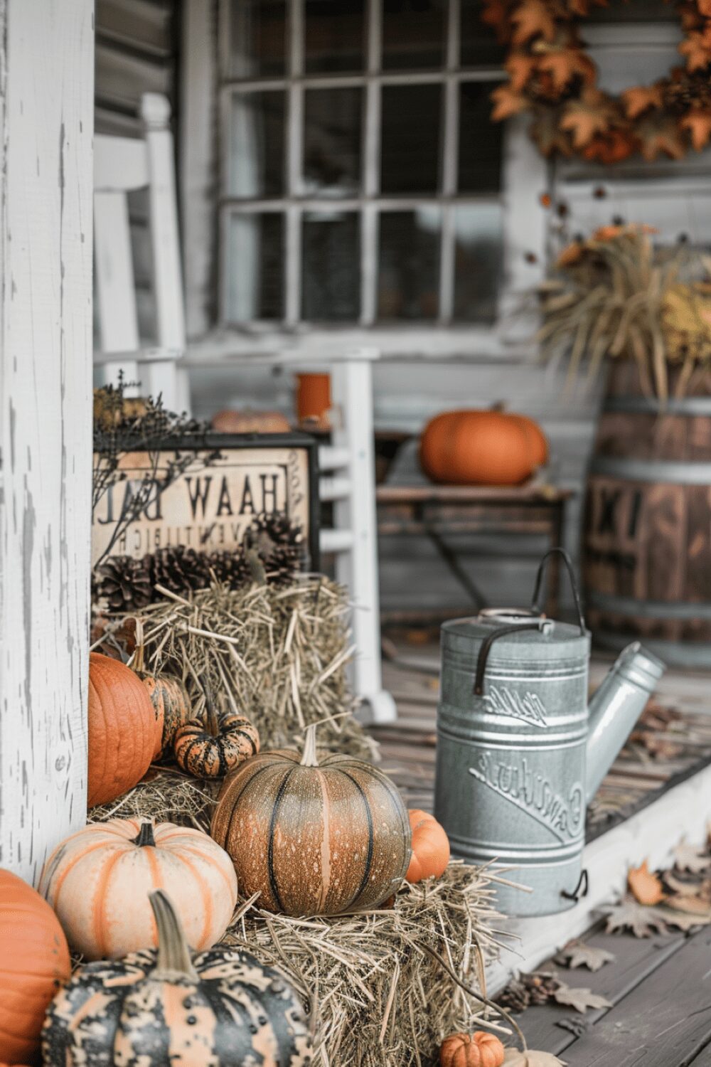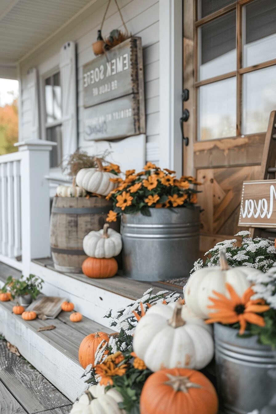 Check out our cozy fall porch with rustic metal planters, a wooden sign, and white and orange pumpkins. It’s the perfect spot to relax outdoors with natural materials and charming vibes.