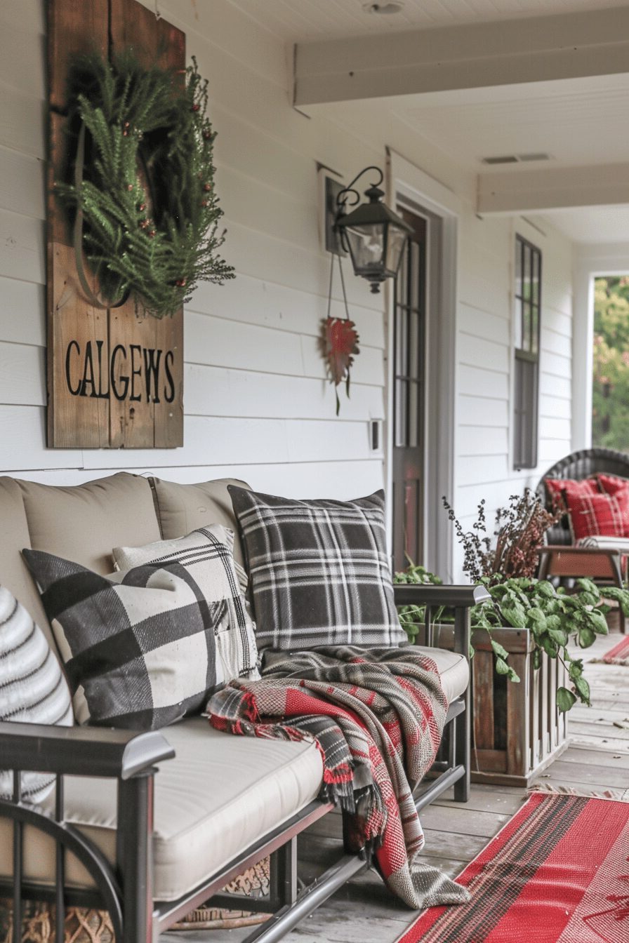 Check out this awesome farmhouse-inspired fall porch! It’s got a comfy seating area, cute plaid blankets, and a big welcome sign. The modern and rustic mix gives off a cozy vibe. Perfect spot to chill out!
