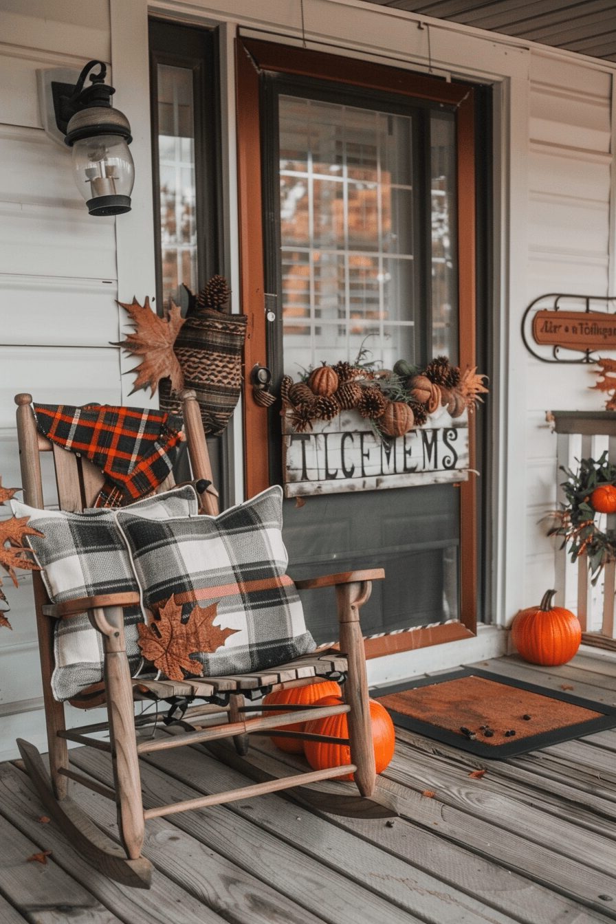 Check out this adorable fall porch! There’s a cozy wooden rocking chair, plaid pillows, and a cute welcome sign with pumpkins. It’s so charming and inviting, perfect for enjoying the autumn season outdoors!