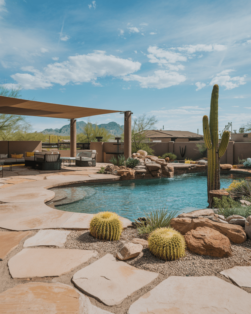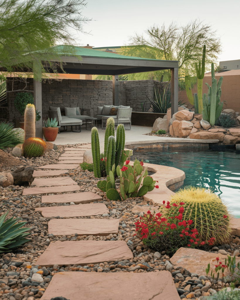 If you live in a hot place like Australia, consider a desert-style tropical pool area as a cool alternative to the usual designs. You can use plants like cacti, succulents, and palm trees that don’t need much water, making it an easy and eco-friendly spot to relax. Natural stone and sandy-colored tiles will give it that dry, desert look. If you’re on a budget, you can use gravel and potted plants instead of doing a complete landscaping overhaul.