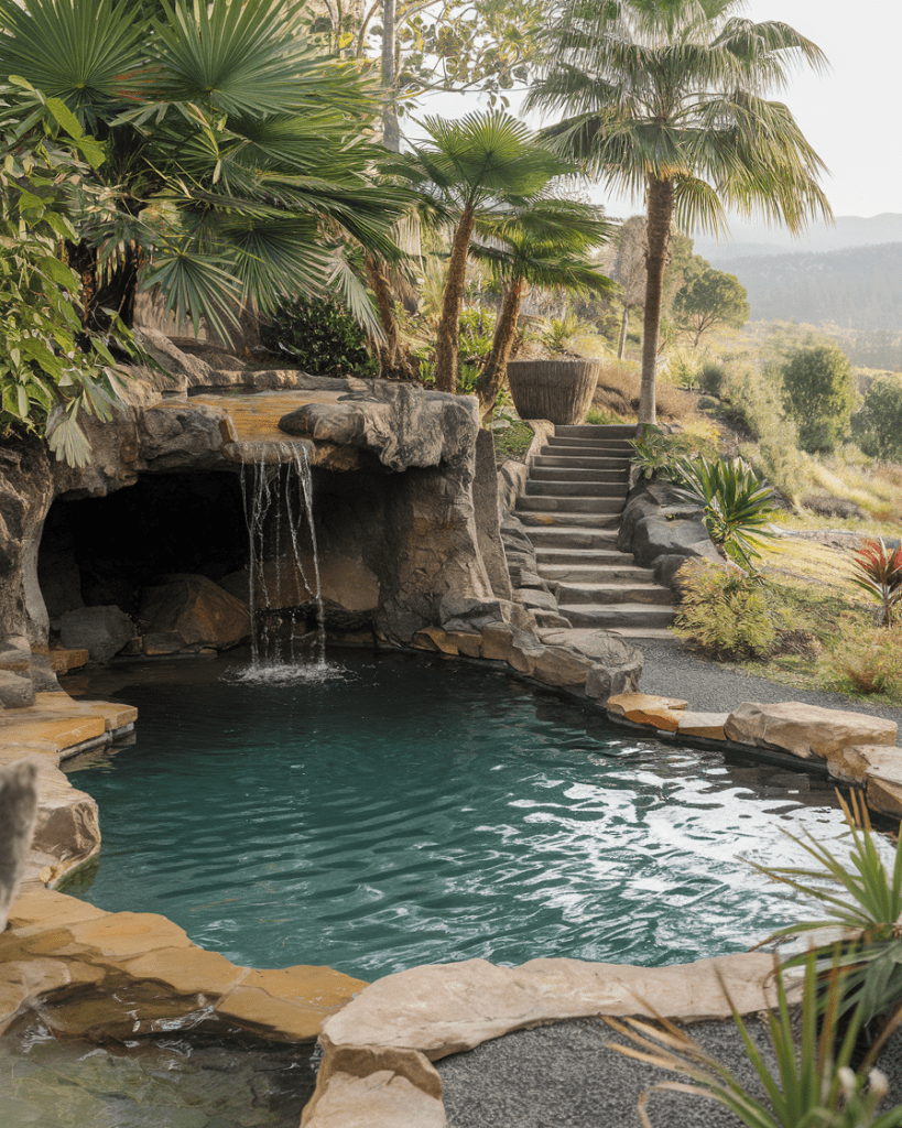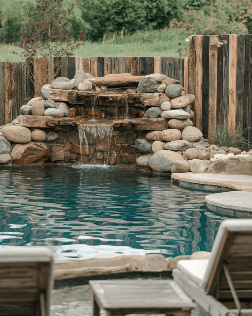 Imagine a cozy pool area surrounded by nature, with reclaimed wood, stone, and natural landscaping. It’s perfect for countryside homes or anyone wanting a peaceful retreat in their backyard. Adding a rock waterfall or wooden decking can really enhance the natural vibe. And if you’re on a budget, think about DIY wooden furniture and natural stone pavers for a wallet-friendly upgrade.