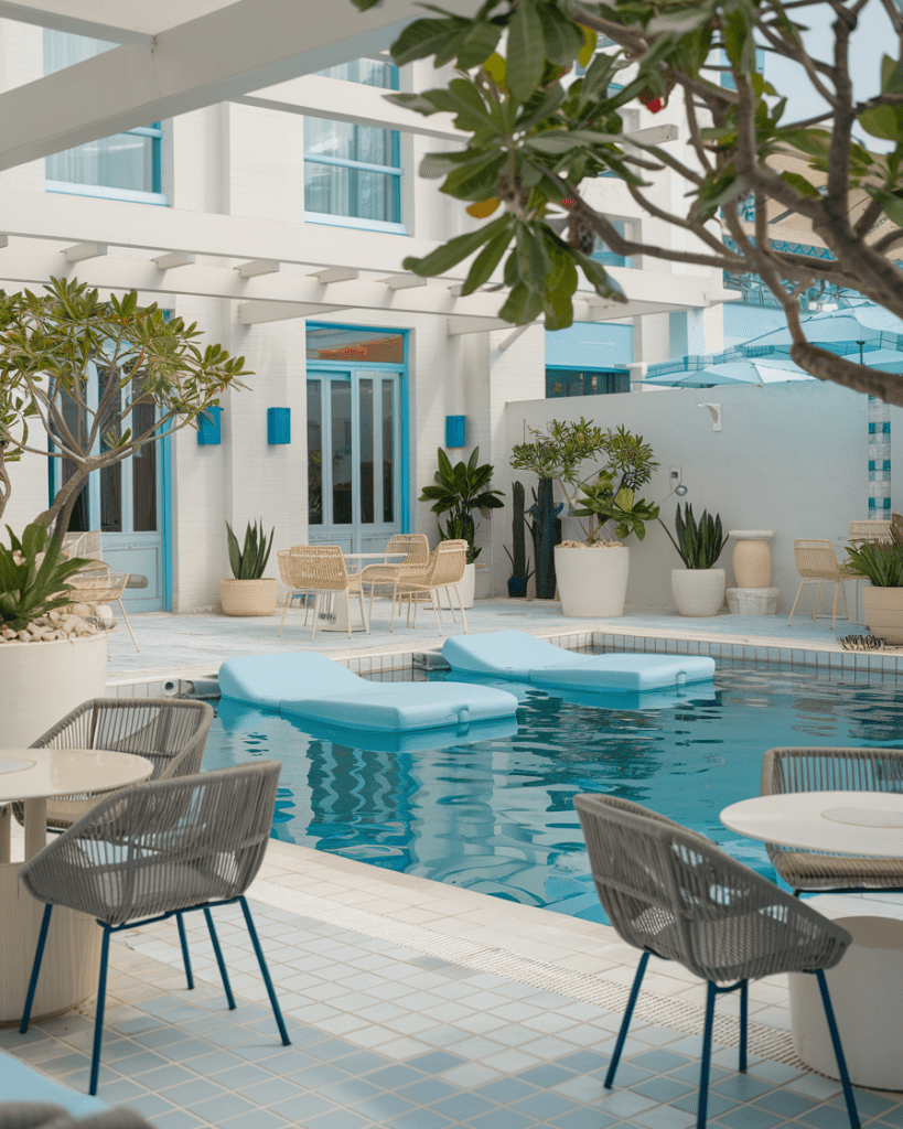 If you’re into a chill, artsy vibe, a boho-chic pool area is just what you need. Think macramé hammocks, rattan furniture, and earthy colors. Add in some outdoor rugs, lanterns, and plants for an extra cozy feel. And if you’re trying to save some cash, get creative with DIY decor like using old pallets for seating and scoring some thrifted boho textiles.