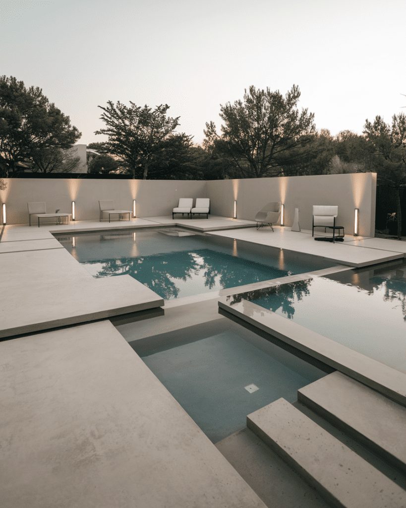 If you like a simple, clean pool area, go for a minimalist style with geometric pool shapes, wood or concrete decking, and neutral colors. This design focuses on open space and practicality, perfect for any size backyard. To save money, go for basic LED lighting and build your own lounge areas.