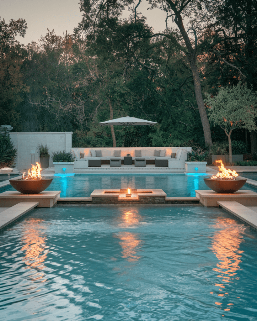 Have you seen how awesome it looks to add fire elements to your pool area? Fire bowls, torches, or a fire pit near the water can really make it pop, especially at night. It’s a great way to add a touch of luxury to your outdoor space for entertaining. And if you’re on a budget, you can try making your own fire pit or use solar-powered fire lanterns for a similar effect. It’s a cool trend worth trying out!