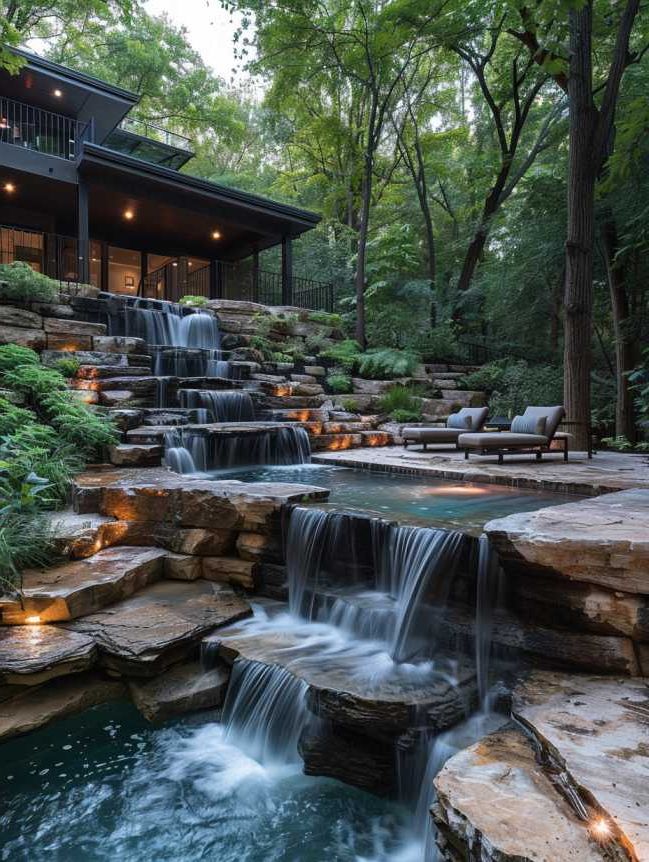 Looking to add a modern flair to your backyard? Try out geometric waterfall designs with shapes like triangles or hexagons for a cool, artistic touch. It’s a unique way to create a visually appealing and modern look in your outdoor space.