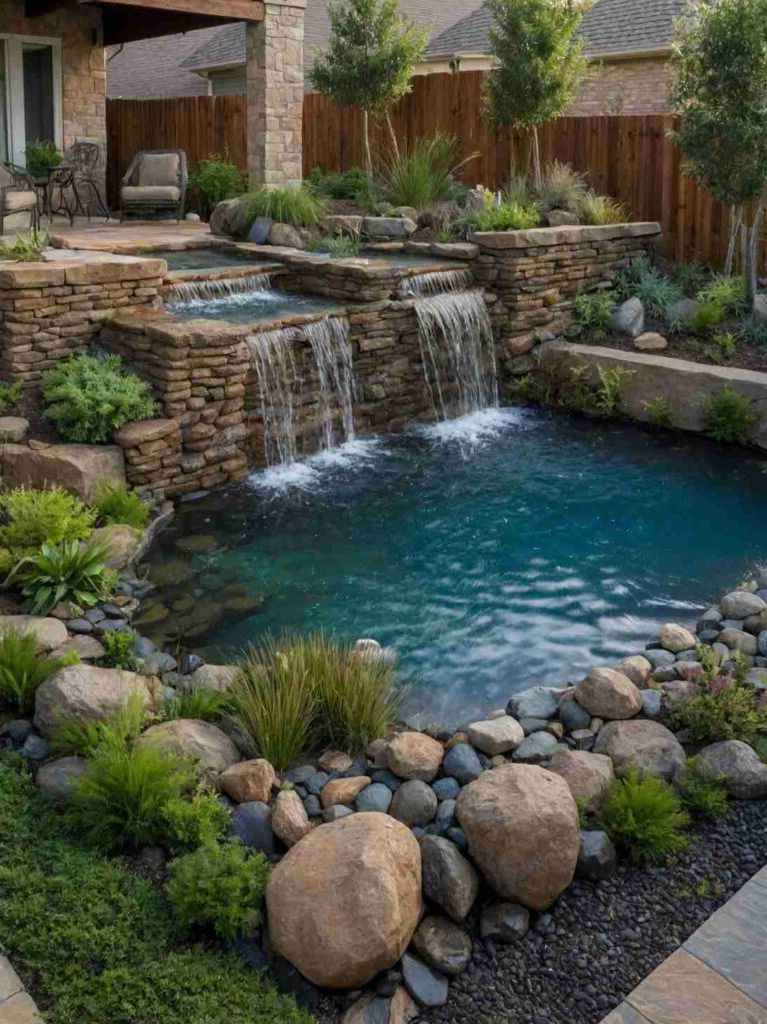 Imagine a cozy backyard oasis with a little pool, stone waterfall, and fire bowls close by. It’s the perfect mix of relaxing water sounds and cozy fire warmth.