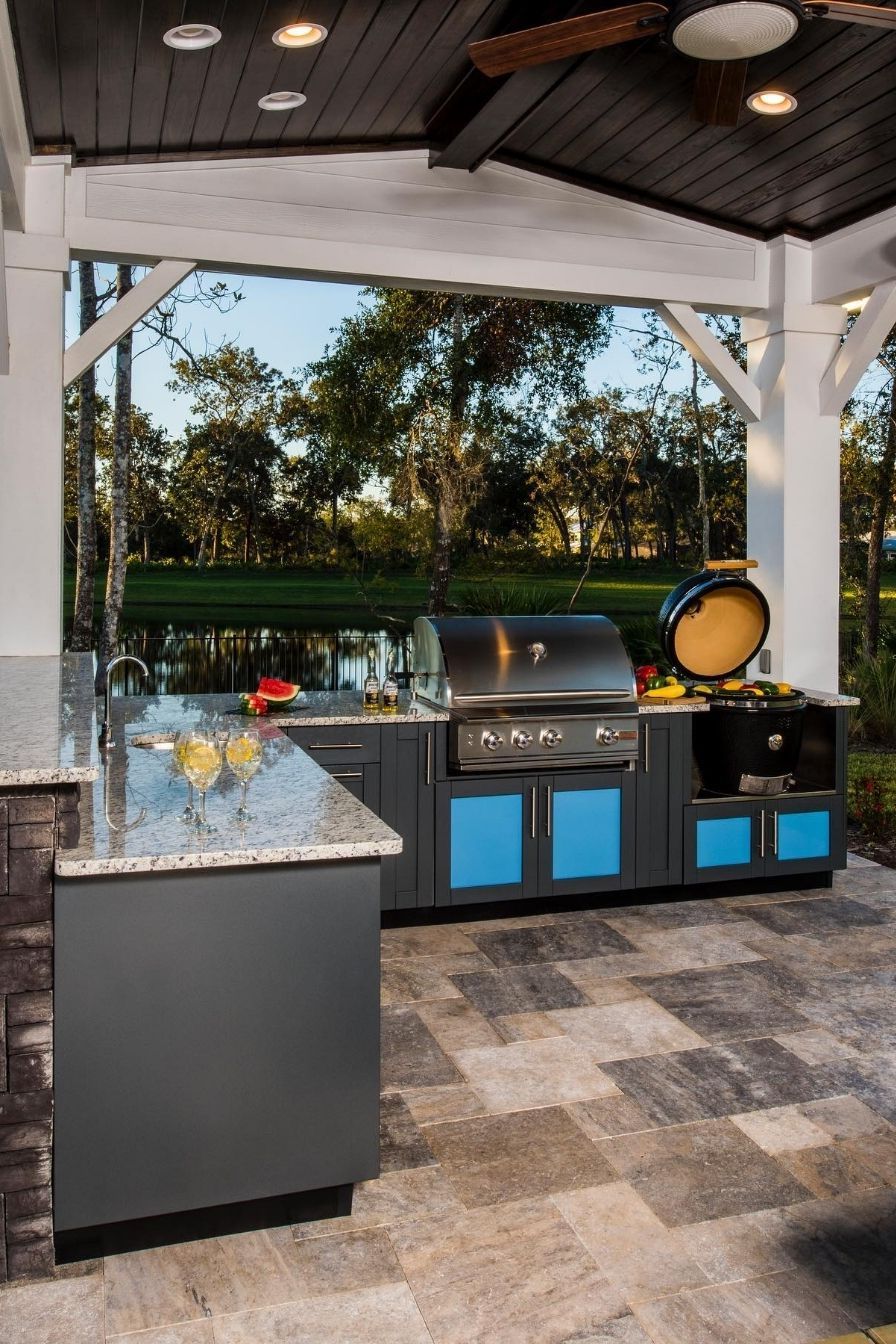 The outdoor kitchen is all about looking good and being super practical. It’s got a cool grill station and a place to get your ingredients ready, all decked out in striking blue cabinets and shiny countertops. Plus, you can chill out on the covered patio and still enjoy the fresh air. And just imagine the view – trees all around and a peaceful lake in the background. It’s the perfect spot to cook up some grub and soak in nature’s beauty.