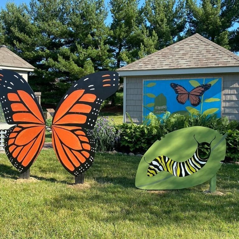 Add a touch of whimsy to your backyard with this adorable butterfly display that tells the enchanting story of caterpillars transforming into butterflies. With colorful, large cutouts against a backdrop of lush greenery, it’s not only a fun art piece but also a great way to learn about nature.