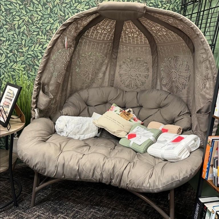 Come relax and unwind in our cozy outdoor reading nook, surrounded by nature. Curl up on the plush canopy lounger and immerse yourself in your favorite book. With soft pastel throws, fluffy pillows, and touches of greenery, this space is ideal for peaceful afternoons and relaxing evenings.