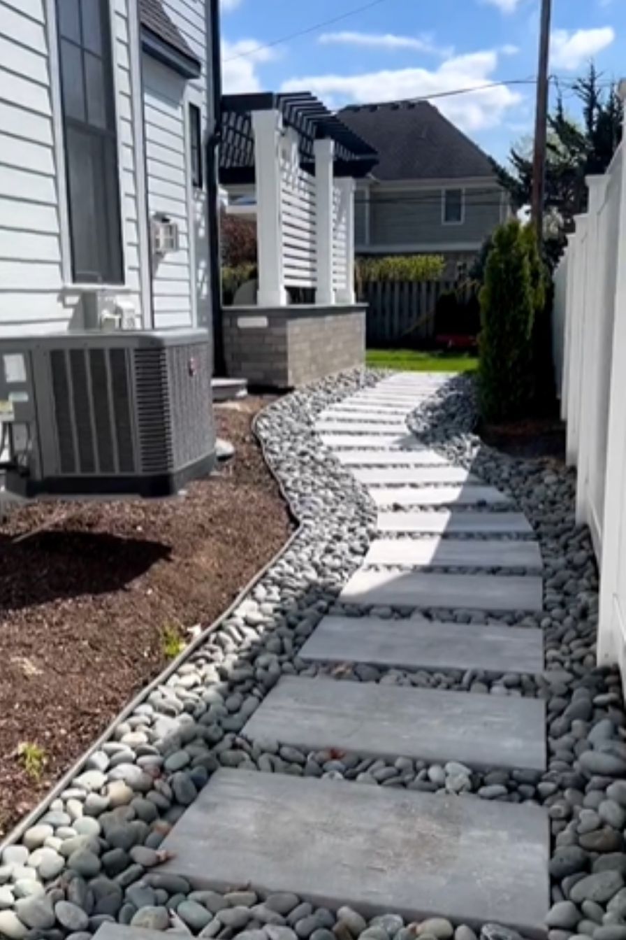 Hey there! So, we wanted to spruce up our narrow side yard and give it a fresh, modern look. We decided to use some sleek rectangular pavers placed on top of smooth river rocks. The curved design really helps to break up all the straight lines of the fence and house, giving it a softer and more stylish vibe. And the best part? It didn’t cost us an arm and a leg!