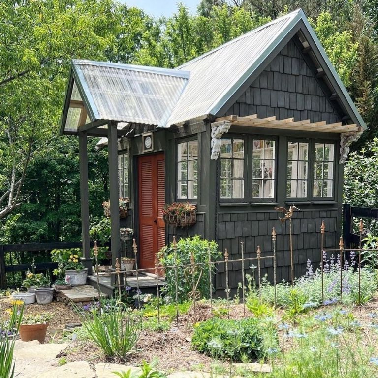 Oh, have you seen that cute little garden shed in the backyard? It’s just so cozy and charming with its rustic feel and smart design. I love the dark wood siding, vintage windows, and that roof that lets in all that lovely natural light. It’s not just practical, it’s also like something out of a picture book with all the blooming plants, climbing vines, and pretty pots scattered around. Just adds that extra touch of beauty to the yard, don’t you think?
