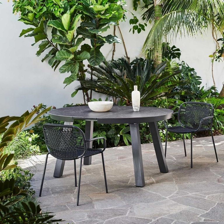 Check out this cozy and stylish dining spot that shows how less can be more! Picture this: a cute little round table with a couple of comfy black chairs, all nestled on a flagstone patio surrounded by lush tropical plants. The white background creates a bright and airy atmosphere, while the greenery gives off a peaceful and natural feel. It’s the perfect place to enjoy a meal and unwind.