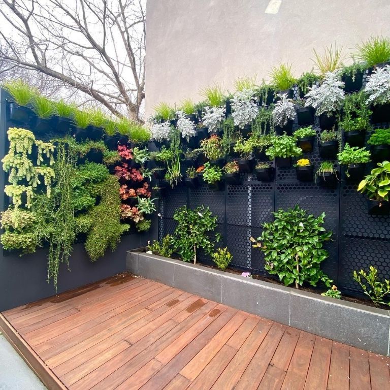 I love how this cool wall of green plants adds so much depth to that little corner of the backyard. The planters are filled with a mix of pretty vines, colorful succulents, and sturdy greens that really make the most of the space. The dark panel behind them really makes the plants pop and adds a nice touch without taking up too much space.