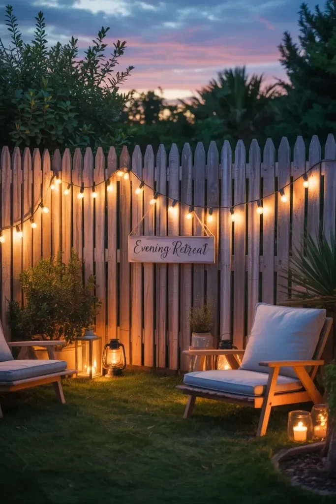 Do you want to add a touch of magic to your privacy fence? Try hanging some string lights! They can turn your backyard into a lovely retreat for evening get-togethers or peaceful moments under the night sky. For a cozy and enchanting vibe, opt for warm white string lights that will give off a soft, tranquil glow. It’s an easy way to create the perfect ambiance for your outdoor space.