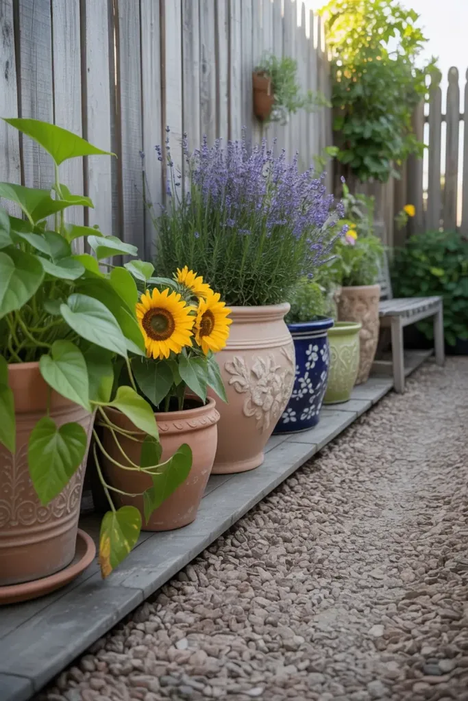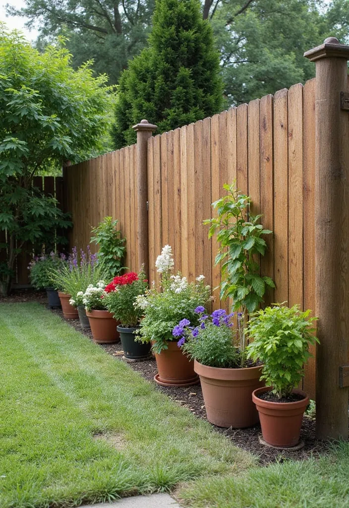 Adding some potted plants at the base of your privacy fence is a great way to make your backyard look more inviting and natural. It’s a fun way to experiment with different plant sizes and colors, giving your outdoor space some depth and character. Give it a try and see how it transforms your backyard!